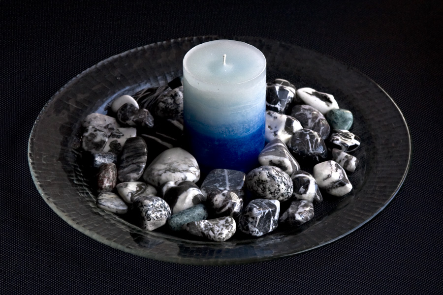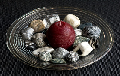 Mittelgrosse Glas-Teller Ø28cm mit 30 "Riverstones" + Kerze