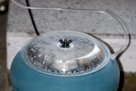 Das 80er Schleifpulver wird sich jetzt schnell an die Steine binden. Nun befeuchte ich das Material durch zugeben von destilliertem Wasser mittels einem "Tropf" mit feinen Dosierungen von einem Wassertropfen pro Minute. So bleiben die Steine stets feucht, aber nicht allzu nass, so dass sich möglichst kein See auf dem Gefässboden bildet (Schlammspritzer).