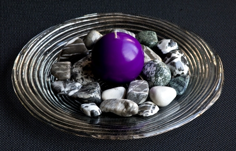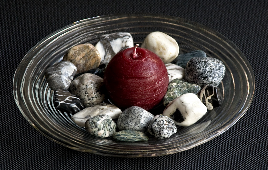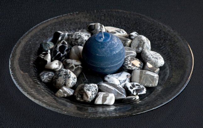 Mittelgrosser Glasteller mit 30 polierten "Riverstones" + Kerze